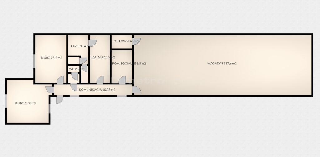 * Magazyn: 188 m² przestronny, wysoki, z szeroką bramą wjazdową i możliwością adaptacji pod lekką produkcję lub serwis.
